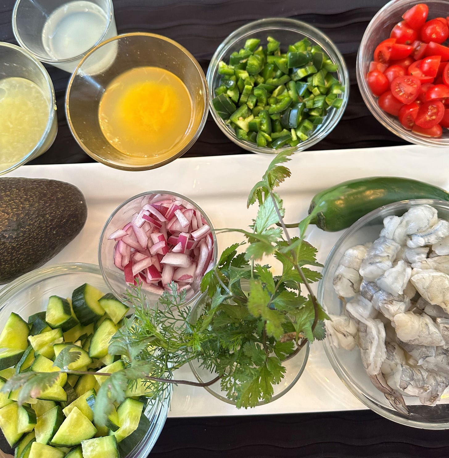 4. Add the finely chopped red onion, jalapeño, cucumber, tomatoes, and cilantro to the shrimp. Gently stir to combine.